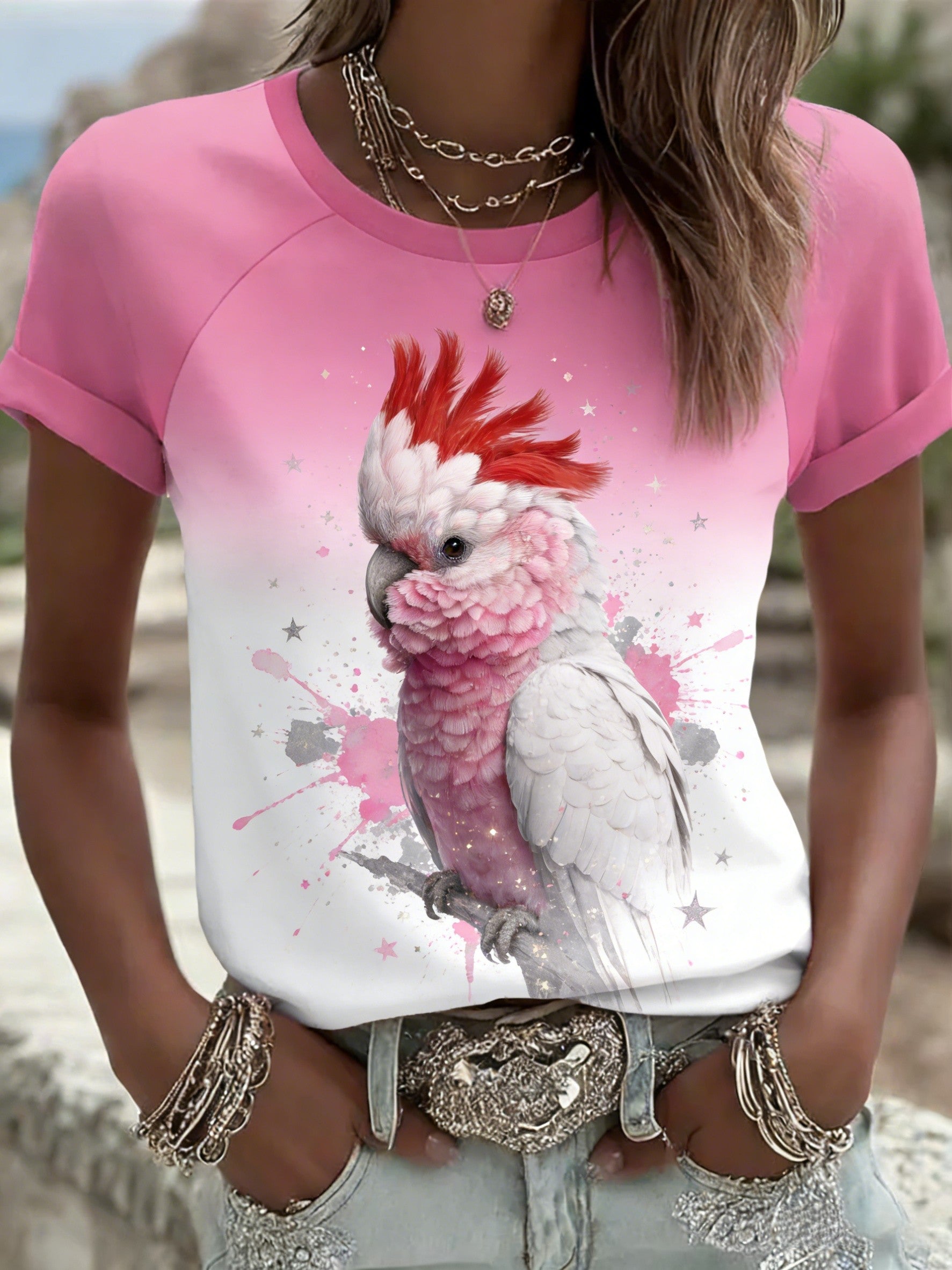 Aussie Vintage bonito cacatua rosa camiseta de manga curta confortável Casual feminino