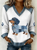 Padrão bonito Dachshund Denim Patchwork Art V-Neck Top do mulheres