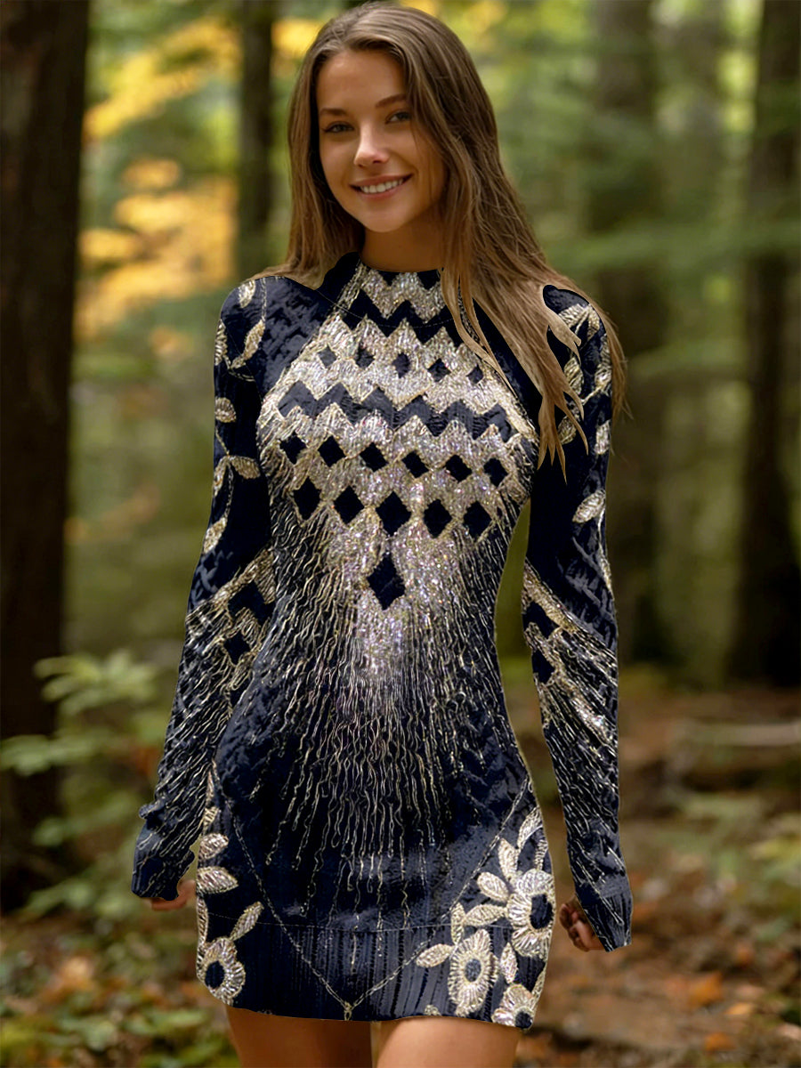 Vestido de manga comprida feminino Floral Glitter impressão preto moda