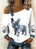 Adorável buldogue francês padrão Denim Patchwork Top das mulheres