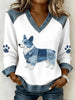 Adorável Corgi padrão Denim Patchwork v-Neck Top feminino