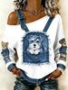 Animal bonito impressão Denim Patchwork Top confortável das mulheres