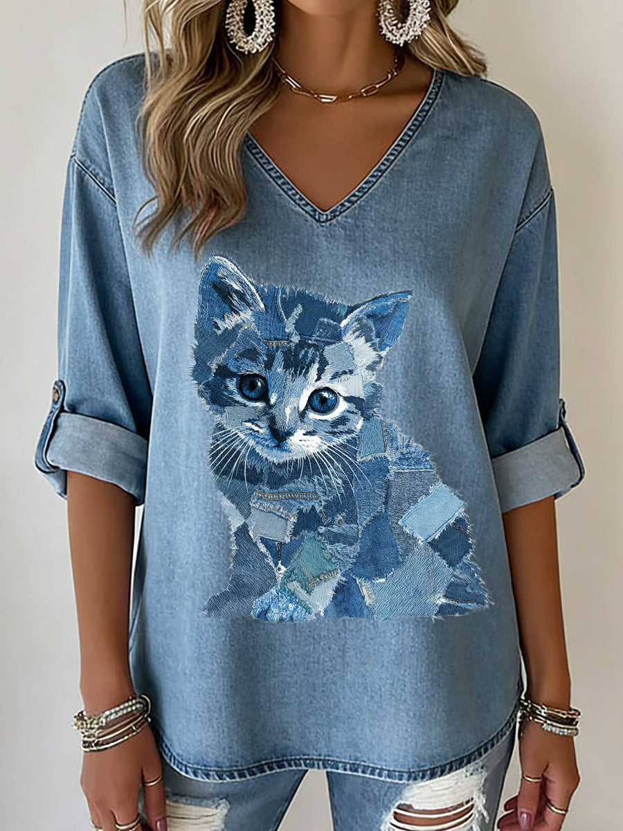 Animal Print V-Neck Mid-Sleeve feminino impresso T-shirt Casual