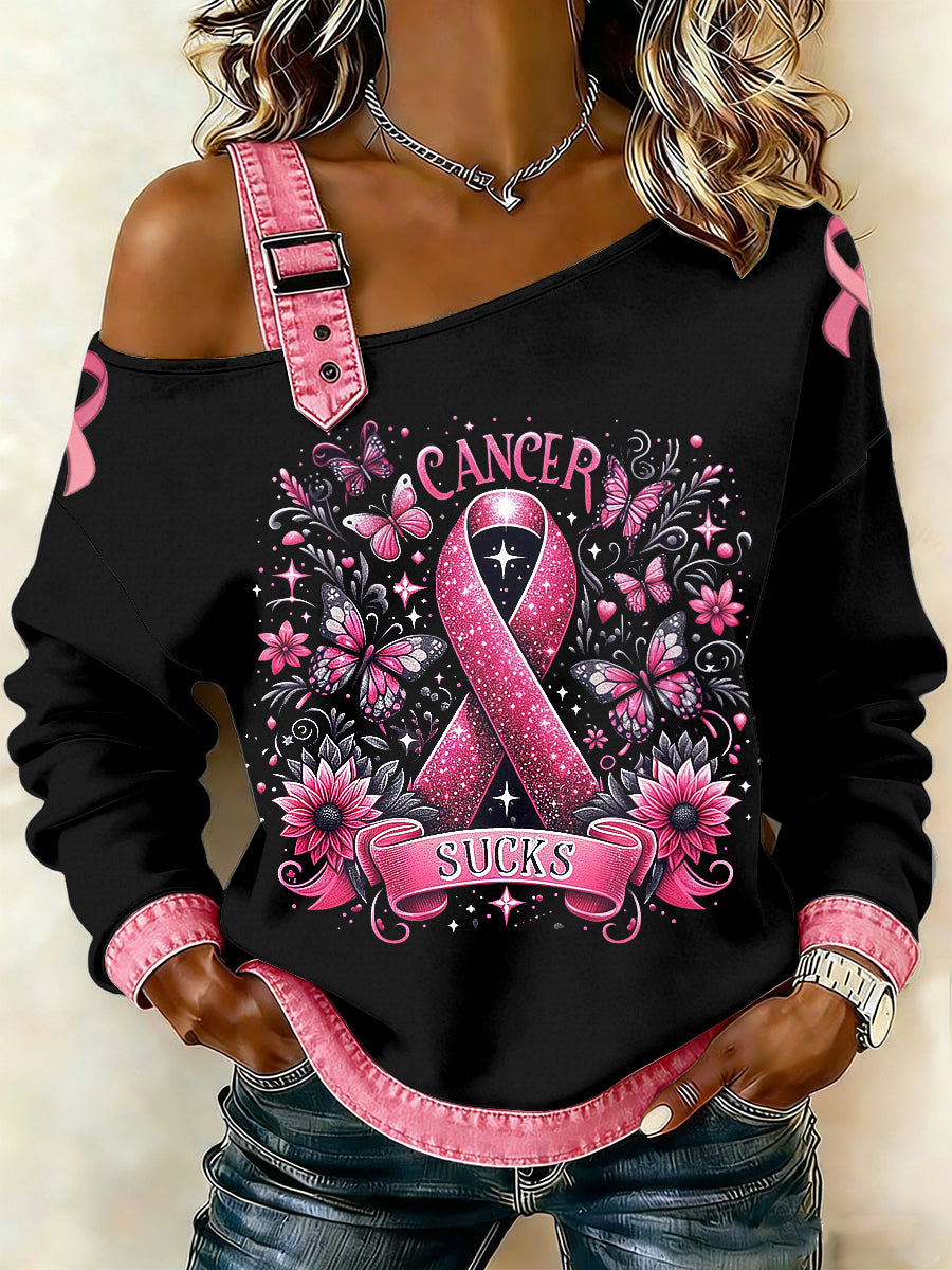 Câncer de mama feminino impresso um ombro Suspender Casual Sweater