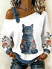 Gato Vintage Patchwork impressão Casual Off-ombro moletom feminino