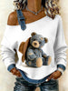 Urso Vintage Patchwork impressão Casual Off-ombro moletom feminino