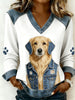 Vintage Denim Patchwork Top feminino com Animal Art Print, casual e confortável