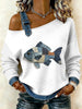 Vintage peixe Patchwork impressão Casual Off-ombro moletom feminino