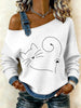 Vintage simples gato patchwork impressão Casual Off-ombro moletom feminino